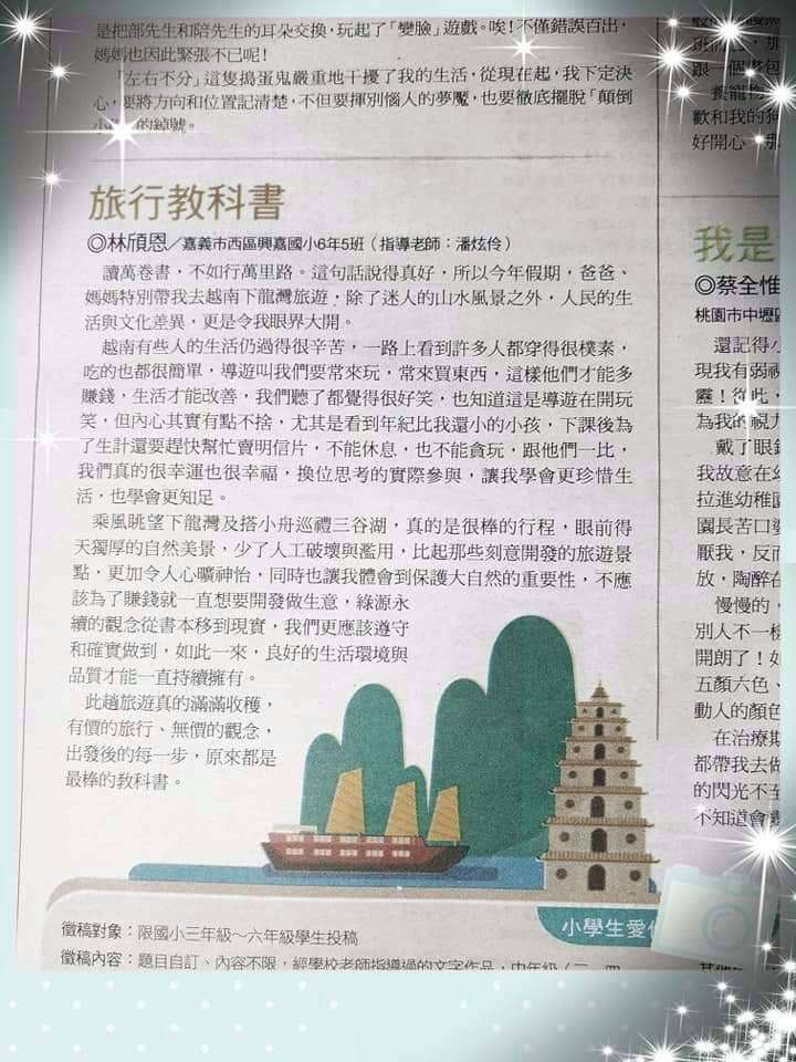 本校6-5林頎恩於5/11獲得自由時報刊登"旅行教科書" 表現優異