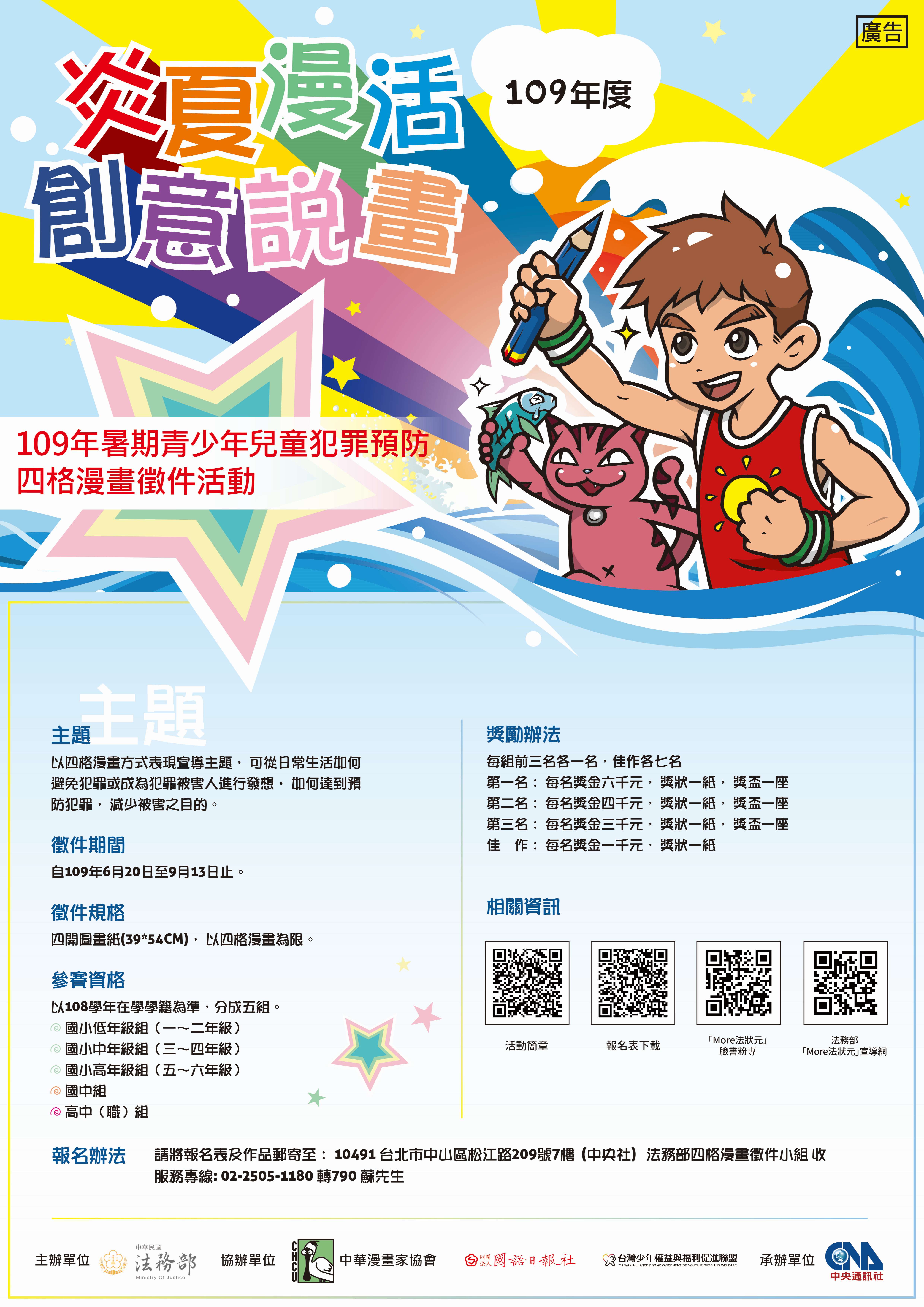 一、有關徵稿活動相關資訊及報名資料下載,請上法務部「More法狀元」網站(https://tpmr.moj.gov.tw/)年度活動項下查詢或facebook搜尋:More法狀元-兒童及少年犯罪預防宣導網。