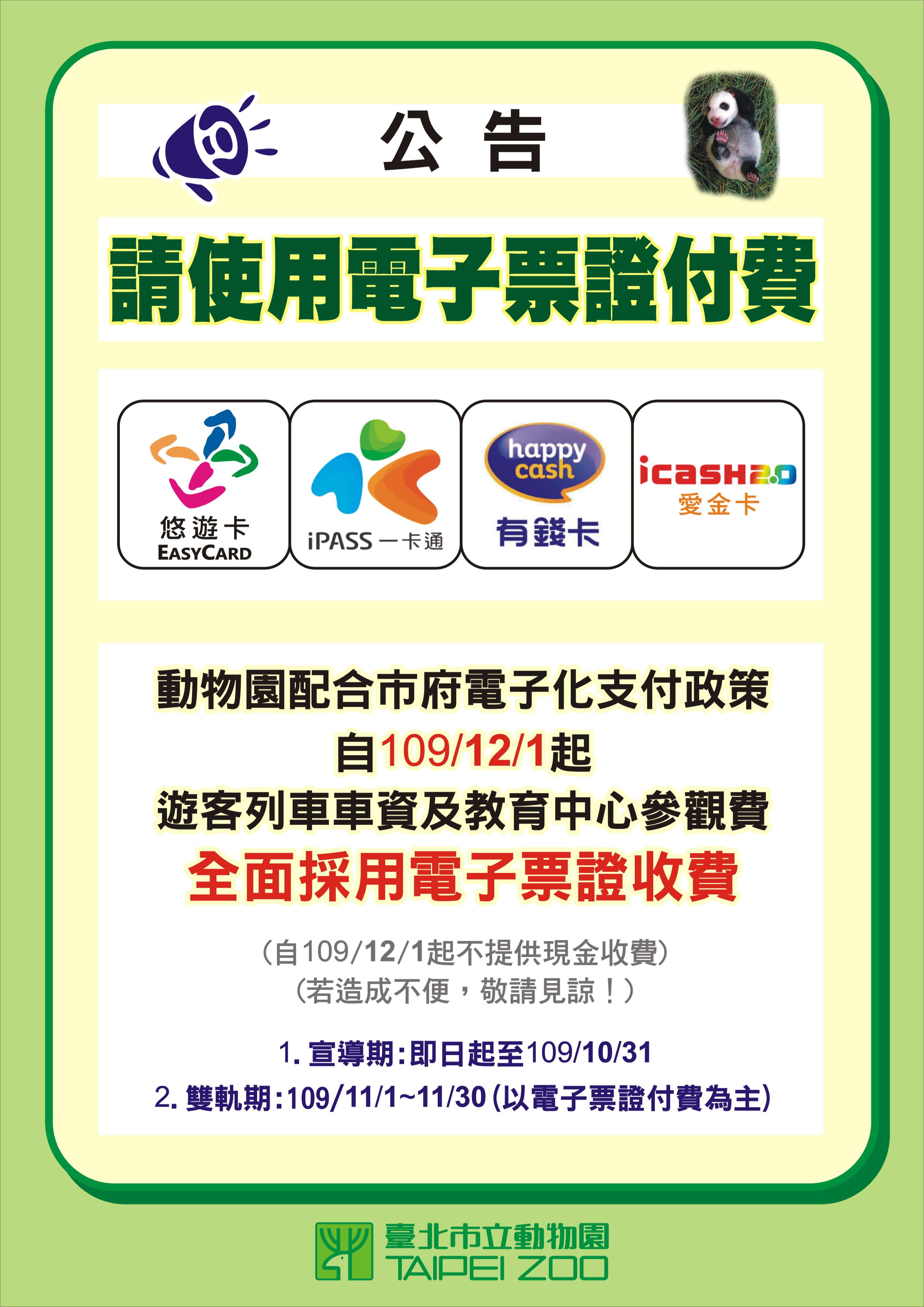 臺北市立動物園為配合市府電子化支付政策,遊客列車車資及教育中心參觀費,自109年12月1日起與現行遊客入園參觀費收取模式一致,全面採用「電子票證」付費方式,將不再提供遊客以現金付費服務;預定於109年11月1至30日期間為宣導期,仍得採用電子票證與現金雙軌付費方式(以電子票證付費為主)。