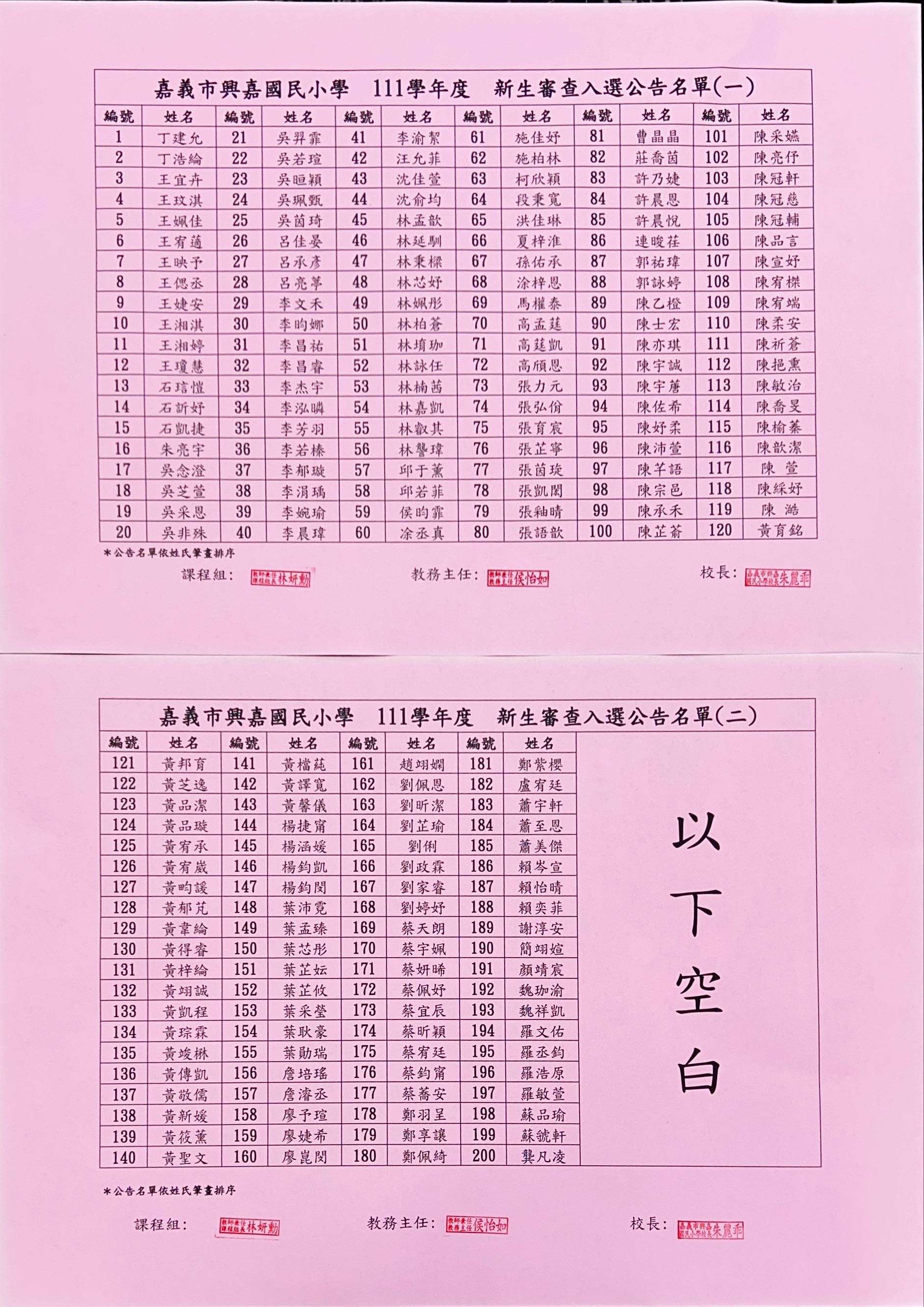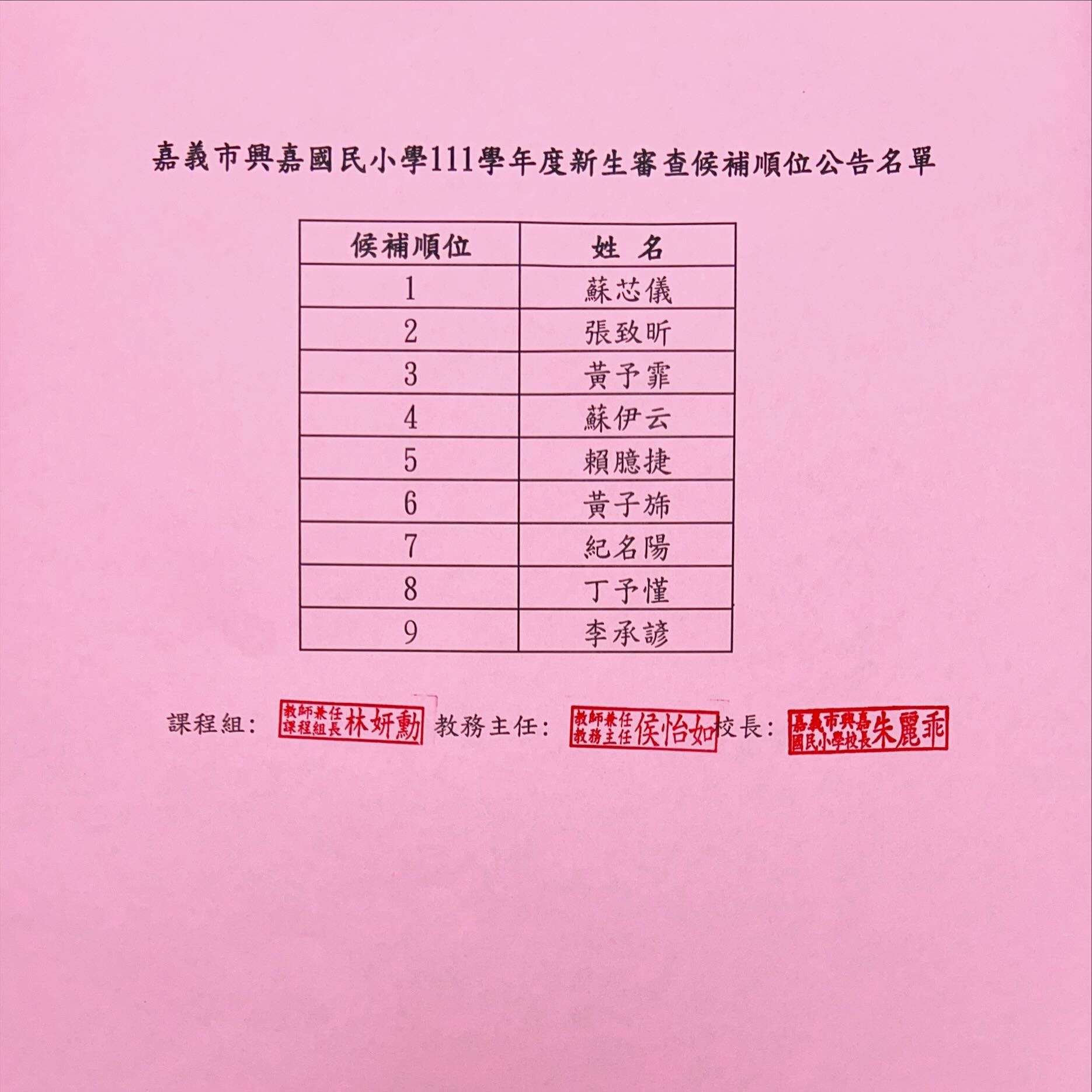 嘉義市興嘉國小111學年度新生審查業已於111年4月20日審查完畢,錄取名單與備取順位如附件。