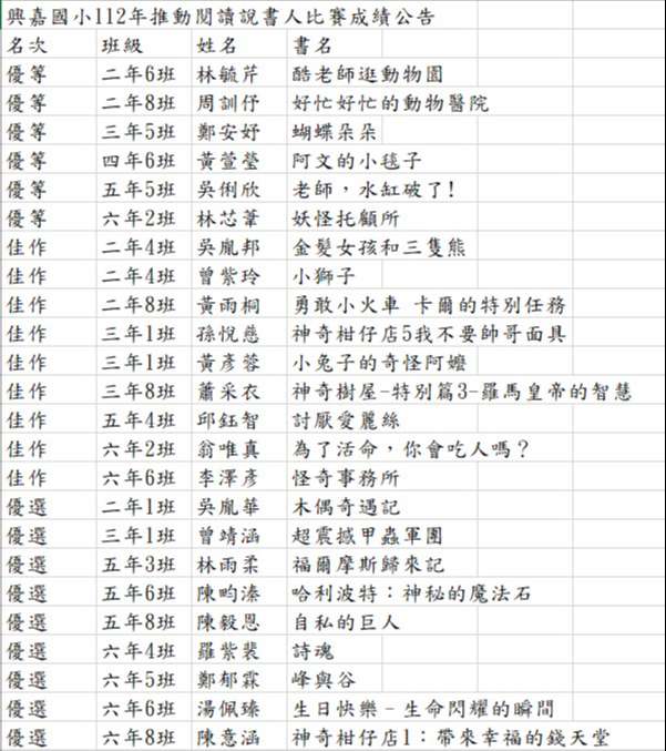 本校112年推動閱讀說書人比賽成績公告詳見附件,