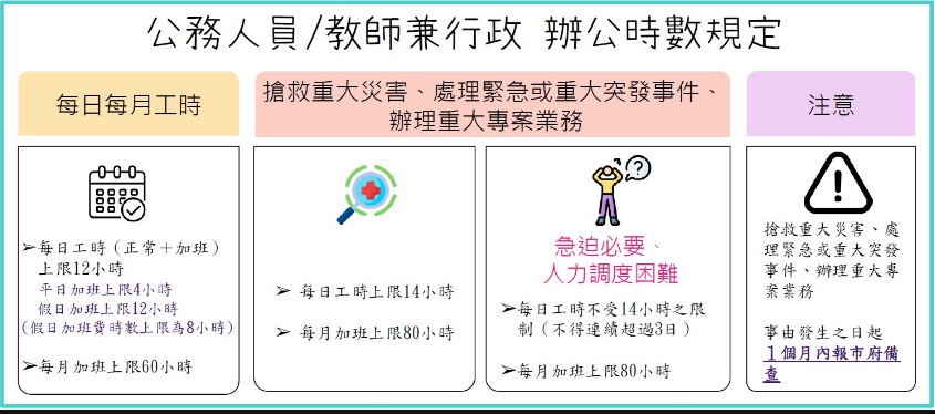 三、公務員為搶救重大災害、處理緊急或重大突發事件、辦理重大專案業務之延長辦公時數,連同正常辦公時數,每日不得超過 14 小時;延長辦公時數,每月不得超過 80 小時。但有急迫必要性,且機關(構)人力臨時調度有困難,不受每日辦公時數上限 14 小時之限制,惟不得連續超過 3 日。(參照行政院與所屬中央及地方各機關(構)公務員服勤實施辦法第 4 條)