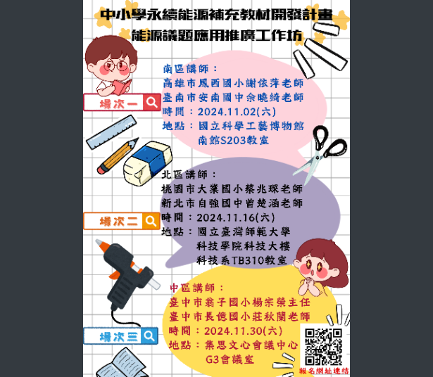 (三)中區場次,日期:113年11月30日(星期六)。課程時間:上午10時至下午5時;地點:集思文心會議中心(G3會議室);實作活動:溫差發電攪拌機、小小水車發電機。