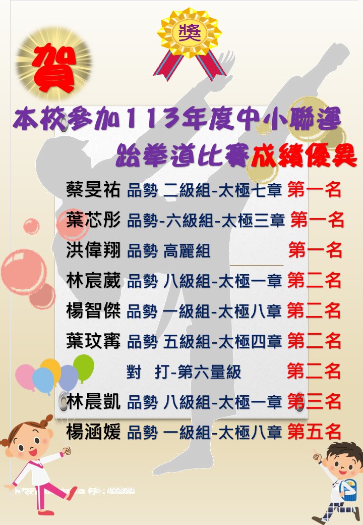 賀,本校參加113年度中小聯運跆拳道比賽成績優異