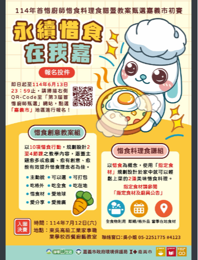 一、環境部為辦理「第3屆首惜廚師甄選活動」,由本局辦理嘉義市地方初賽,參賽組別有料理食譜組及創意教案組。