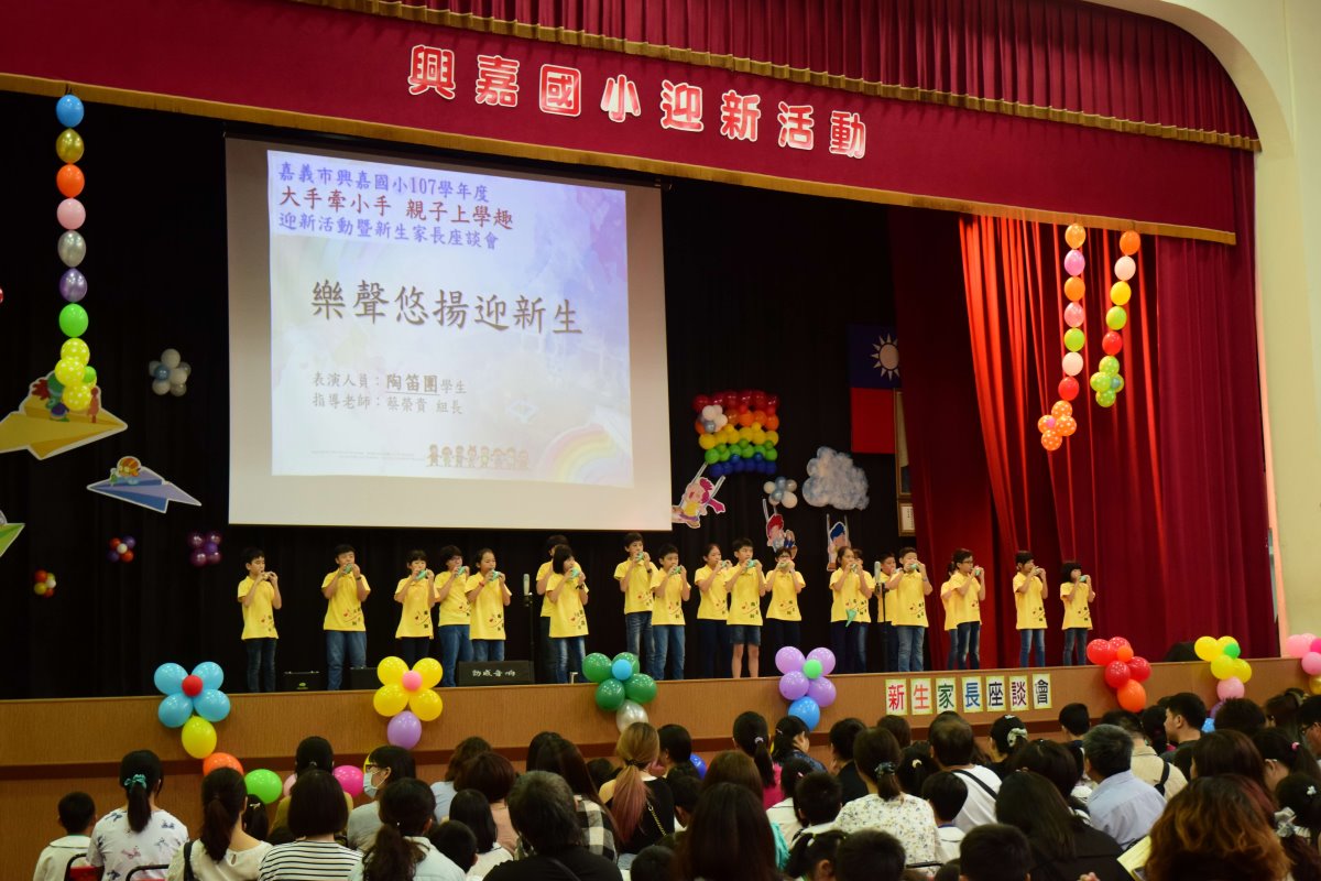 待新生及家長魚貫進入會場就座後,一連串的舞蹈、陶笛及管樂表演,嗨翻全場,除了展現興嘉學子多元學習的成果及活力外,也希望日後小寶貝們能追隨學長姊的腳步,學習多元的才藝,在興嘉有多元的舞台。