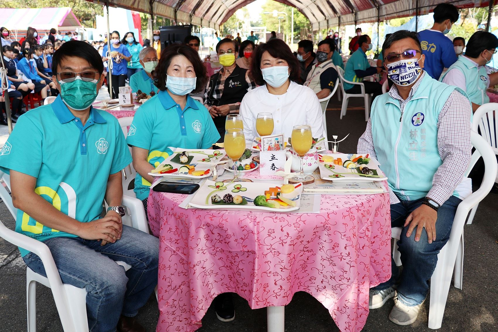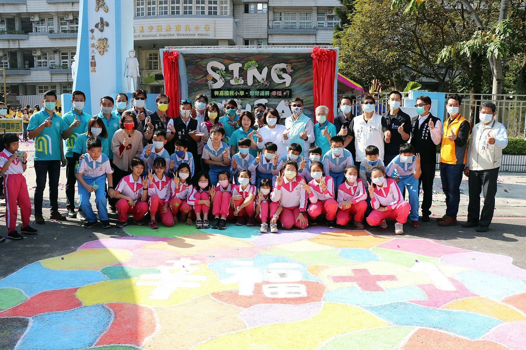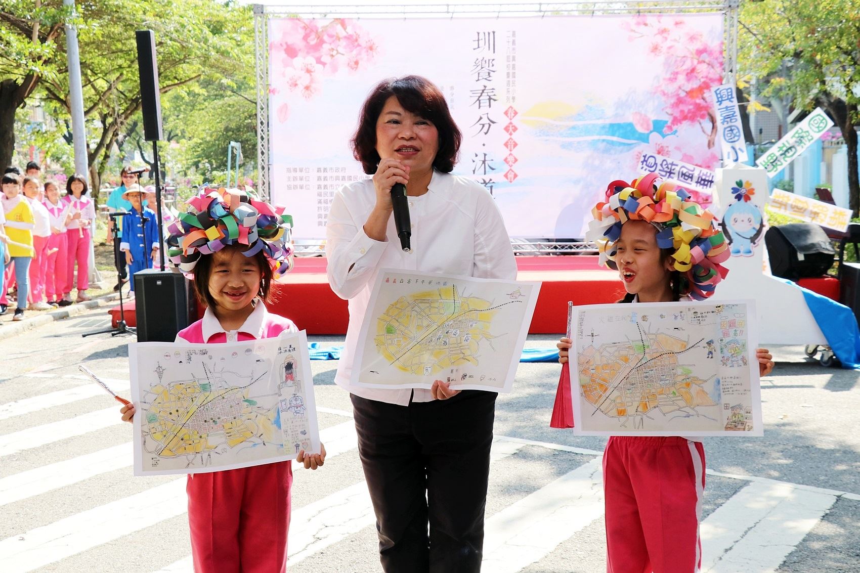 黃敏惠市長表示,幸福的人營造幸福的城市,而幸福要經過辛苦後才能獲得。教育能展現多元探索的精采能量,獲得更多養分,每一個孩子都是獨一無二的個體,發展各種興趣與才能。今天看到孩子們在校園地面上畫出彩色共融的「幸福+1」嘉義市(桃城)地圖;聽到各式美妙音樂(管樂、合唱團、陶笛、直笛等);為城市水文意象創作「道將水趣」揭牌;品嘗學生擺盤餐宴,回應嘉義畫家陳澄波寫生《嘉義郊外》、《田園》風光的在地饗宴;更有中年級學生設計的多元城市文化主題地圖。昨天的春雨是及時雨,春雨過後,品嘗土地鮮味之時,聆聽春的音樂,共享土地配方。