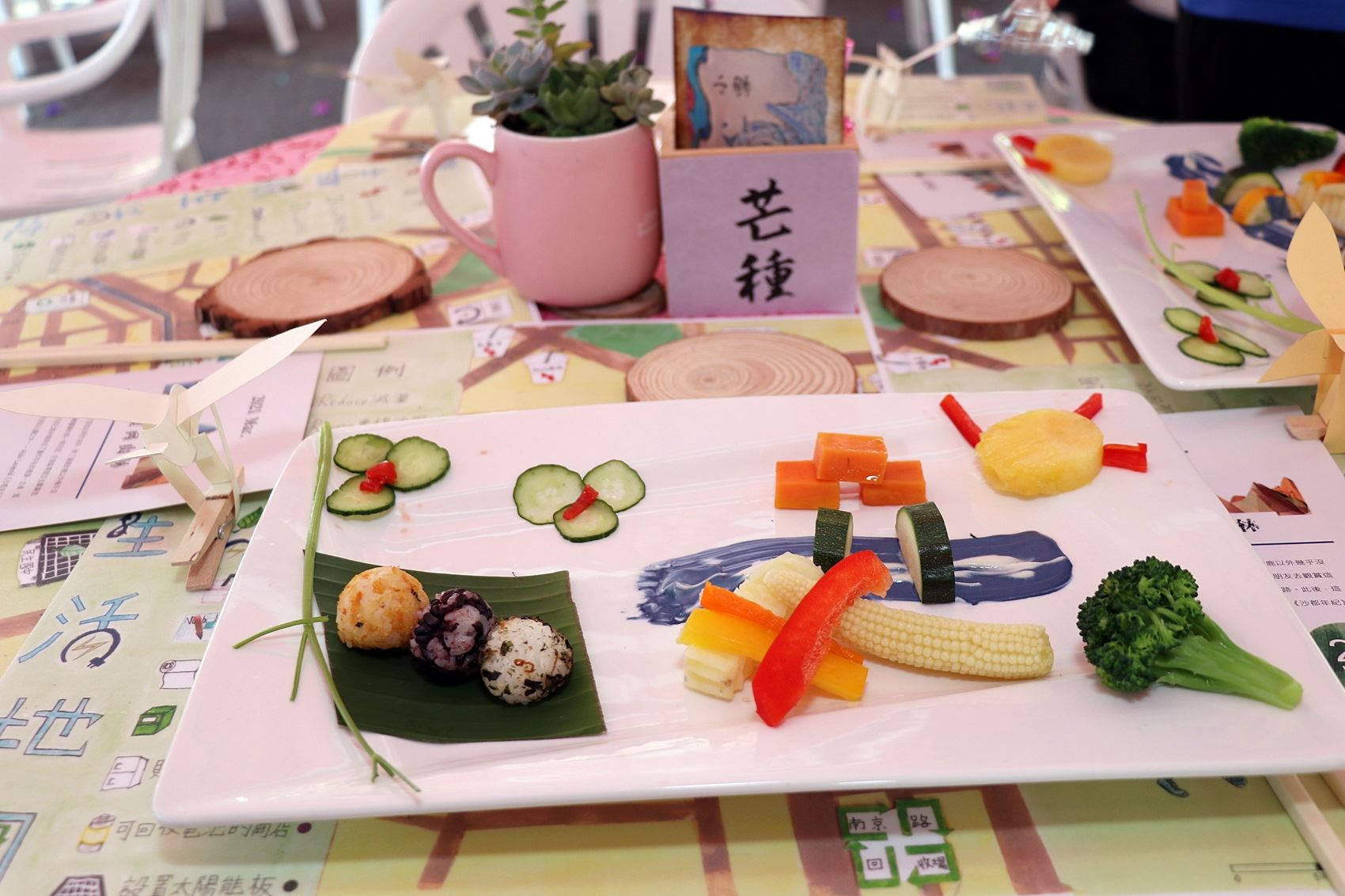 興嘉國小校長朱麗乖說,此次宴會的主題「嘉義郊外」,從陳澄波望向山林意象的風景圖反思現代化社會下的風景圖像,符應嘉義市「望向山林」市訂課程的理念與精神。餐宴食材來源有來自嘉義魚寮社區的米、嘉大的南瓜與甜椒、更有有機農場與小農市場等各式農作物與水果。