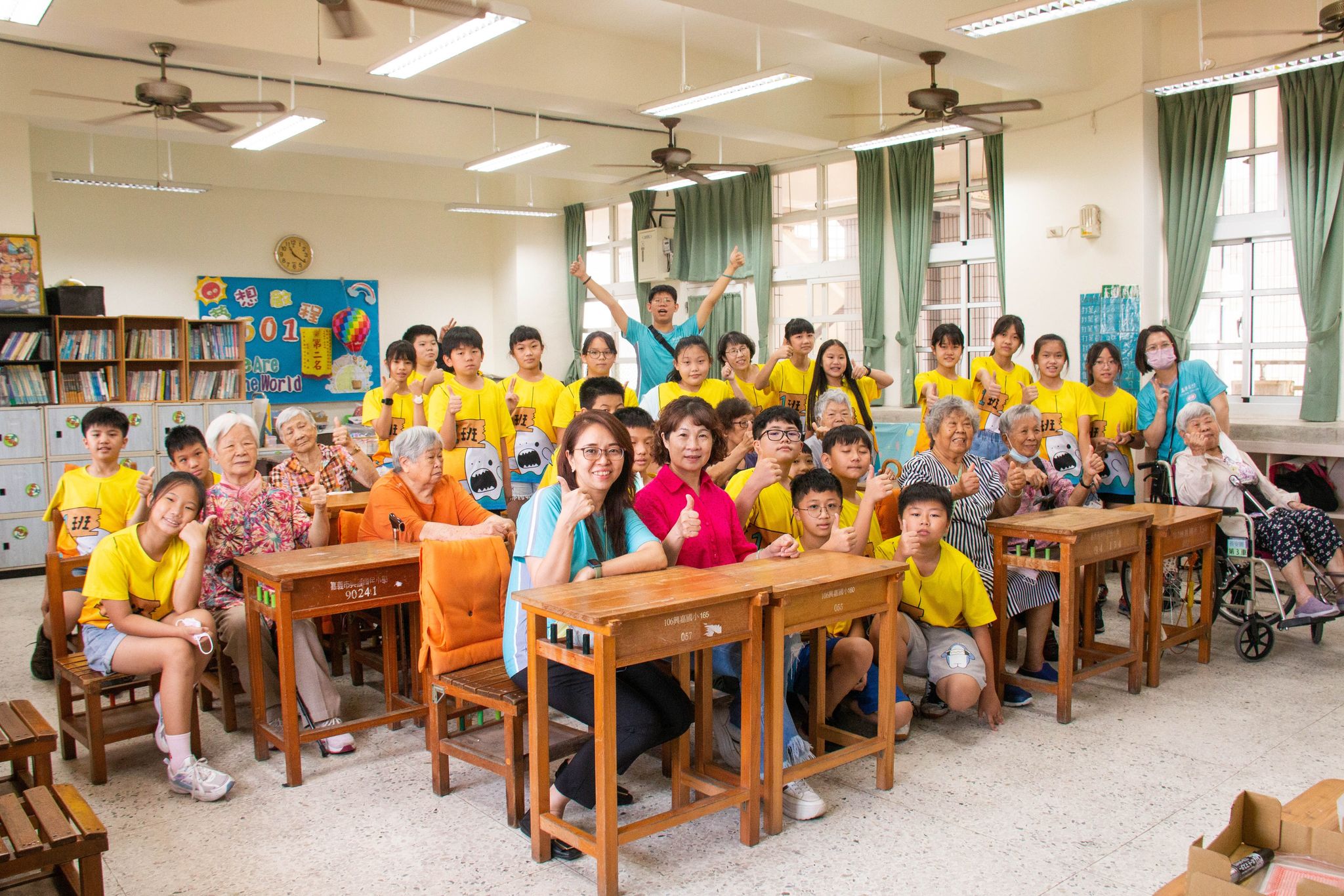 圖說:老幼共融玩科學活動團體照(興嘉國小校長朱麗乖(前中)、嘉基長照服務發展中心副主任曾麗吟合照)。(照片/保康基金會提供)