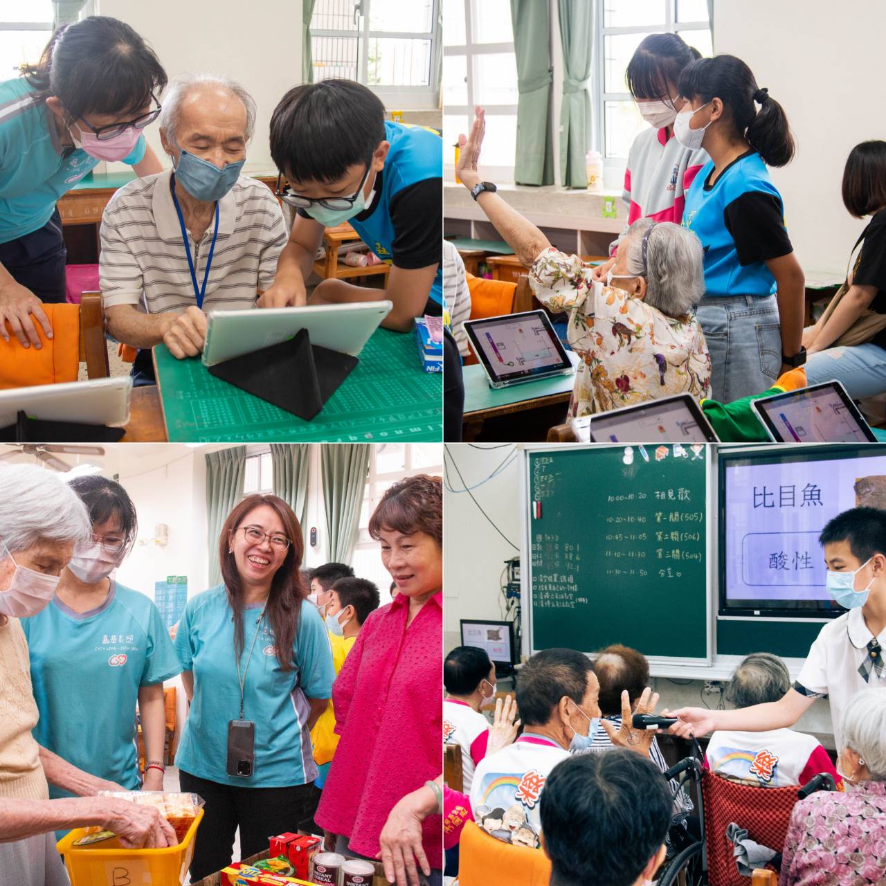 圖說:社工與小朋友共同協助長輩學習使用平板、舉手搶答熱情的與長輩互動。(照片/保康基金會提供)