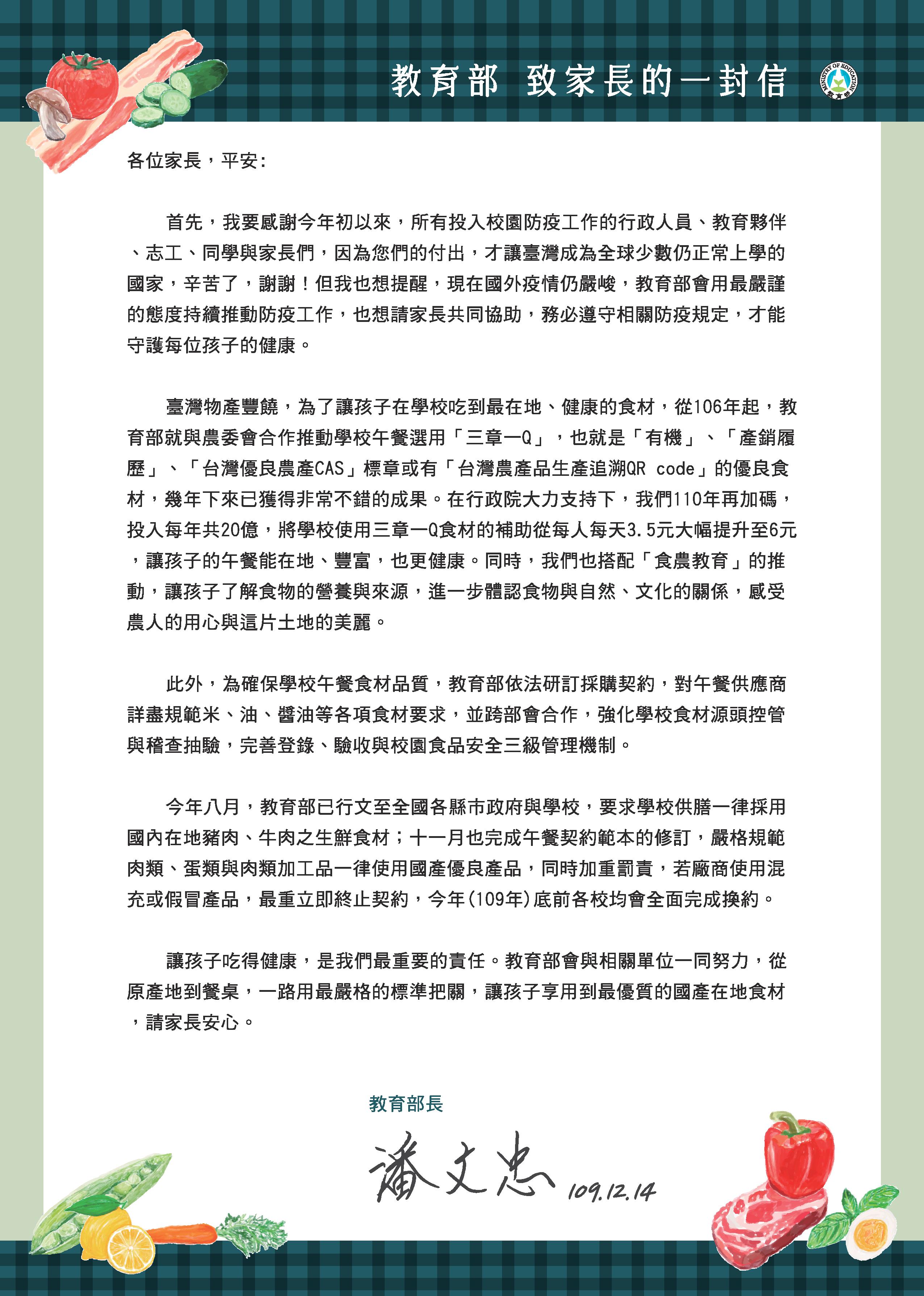 依據市府109年12月15日府教輔字第1095341185號函,公告教育部「致家長的一封信」如下: