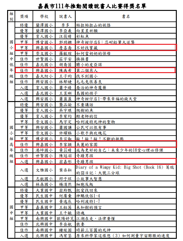賀!國小組中低年級組榮獲甲等,說書人:詹喜喬,書名:不好找寶藏。