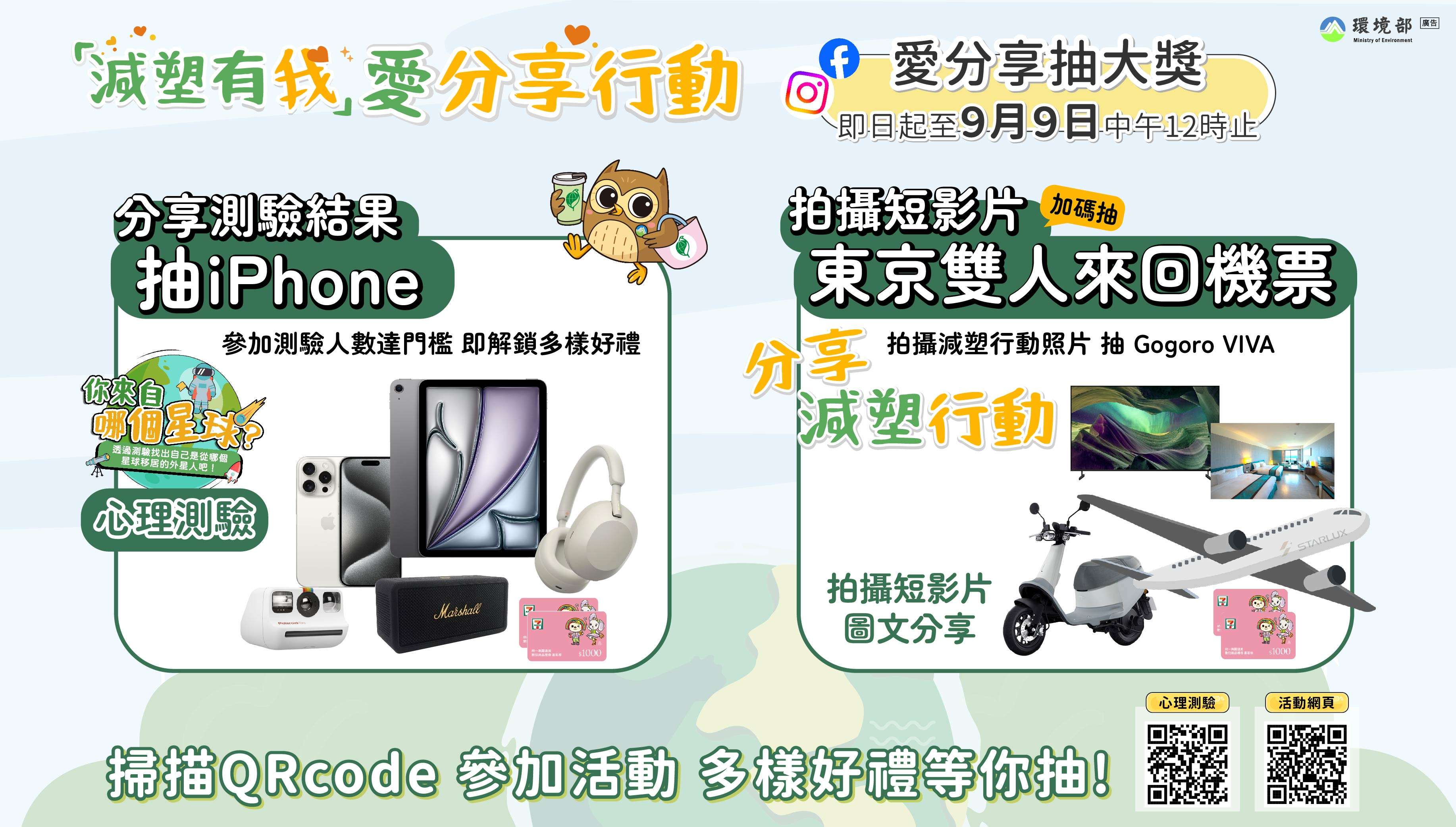 二、環境部為鼓勵社會大眾及莘莘學子在暑期假期間一起跟上全球減少塑膠的風潮,特辦理「減塑有我」愛分享行動,可透過臉書(Facebook)、Instagram(IG)等社群媒體,拍攝個人生活中減塑短影片、減塑生活照片,並可透過參加「你來自哪個星球?」心理測驗遊戲,瞭解並發覺屬於自己獨特的環保行動,歡迎民眾邀請親朋好友一起在生活中響應減塑行動,參加旨揭活動拿大獎。
