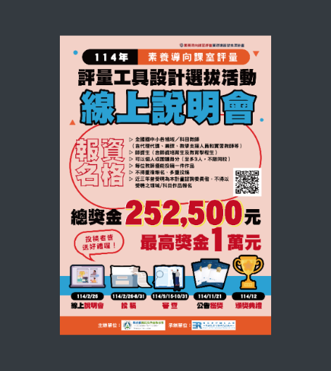 主旨:國立臺灣師範大學辦理114年素養導向課室評量工具設計選拔活動及說明會。