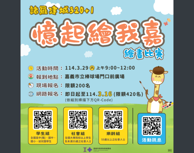 為加強推廣租稅教育,稅務局訂於114年3月29日(星期六) 上午9:00至12:00舉辦114年諸羅建城320+1「憶起繪我 嘉」繪畫比賽,