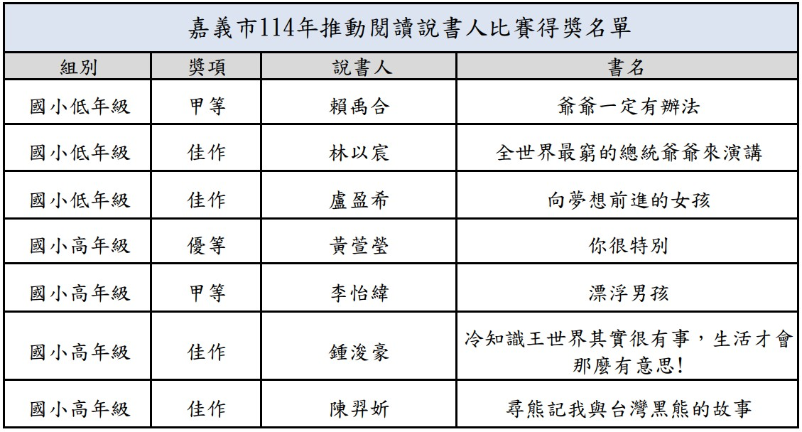 嘉義市114年說書人獲獎名單,恭喜以上獲獎同學。