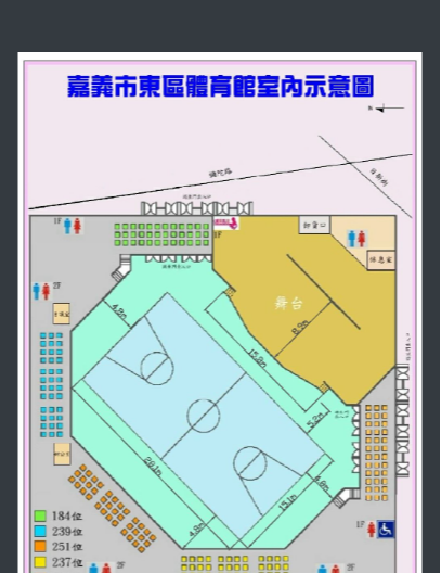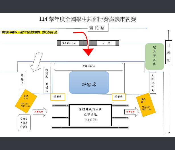 2.比賽地點為嘉義市東區體育館,道具出入口為彌陀路機車道出入,機車道路寬為6米,請注意道具車大小,以免阻塞機車道交通動線。