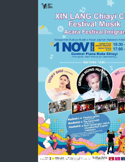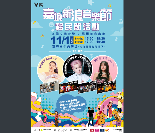 2025嘉城新浪音樂節暨移民節活動11月1日15時30分於本市中央廣場舉行,請家長帶領子女共同參與活動,並藉由欣賞異國歌舞表演、新住民成果展示、美食品嚐等活動,提升學生尊重、接納多元文化差異之素養,以培養寬廣之國際觀,營造溫馨友善之校園、建構多元文化社會。邀約一起體驗多元文化饗宴。
