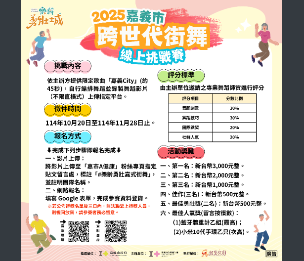 1、將影片上傳至「嘉市A健康」粉絲專頁指定貼文留言 處,標註「#樂齡勇壯嘉式街舞」,並標註團隊名稱 (網址:https://www.facebook.com/share/p /1CyyqcMxpo/)。 2、填寫Google表單,完成參賽資料登錄,就有機會得獎 金。
